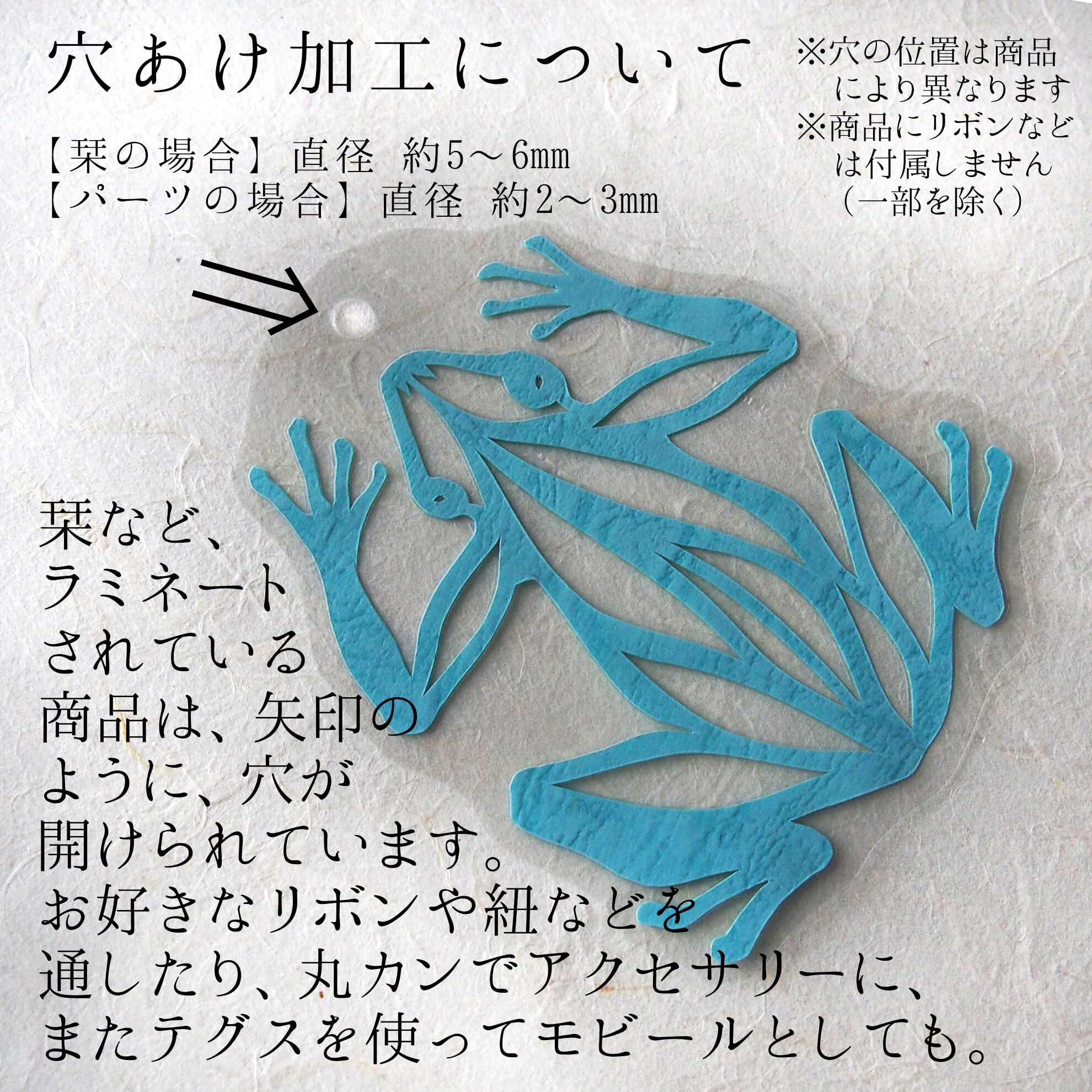 ラミネートの端には穴が開けられていますので、お手持ちのリボンや紐を通して、栞のワイポイントにしていただいたり、テグスを結んで天井や窓辺にぶら下げてインテリアとしてもお使いいただけます。